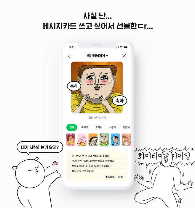 아울러 선물과 함께 진심어린 마음도 함께 전할 수 있도록 네이버웹툰과 그라폴리오 작품이 담긴 ‘메시지 카드’(사진)도 새롭게 선보인다. 축하, 감사, 위로, 사과, 응원뿐 아니라 끼니 걱정 같은 일상 속 감정을 재치있게 표현한 카드 60여종을 선택할 수 있다.