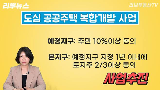 도심 공공주택 복합개발 사업은 주민 10%이상 동의를 구한 곳은 예정지구로 지정하고, 예정지구 지정 1년 이내에 지구지정에 필요한 토지주 3분의 2 이상의 동의를 확보하면 본지구로 지정해 사업을 추진하게 되는데요.