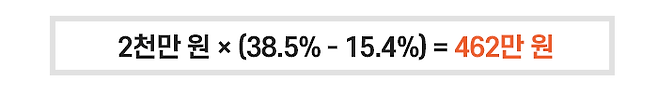 따라서 금융소득 2천만 원 초과분에 대해 추가로 납부할 세액은 38.5%를 적용해 계산한 세액에서 원천징수세율 15.4%를 적용해 기납부한 세액을 뺀 금액 462만 원입니다.