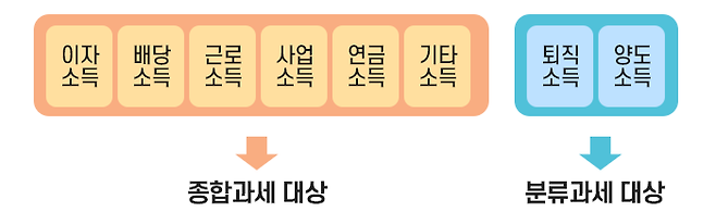 그리고 양도소득과 퇴직소득은 다른 소득과 합하지 않고 별도로 과세되는 분류과세 대상 소득입니다.