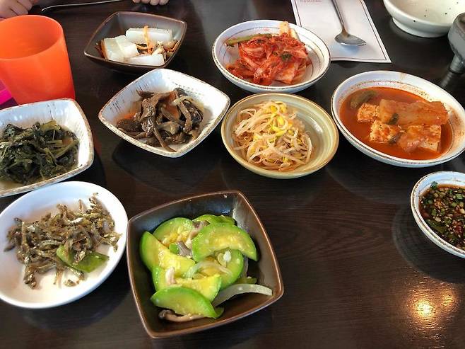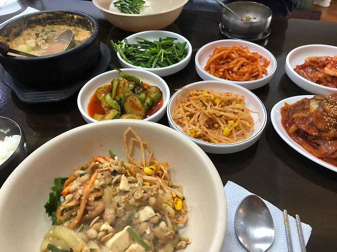 청국장을 주문하면 큰 대접을 내어주고 같이 비벼먹을 수 있게한 반찬들을 제공한다.