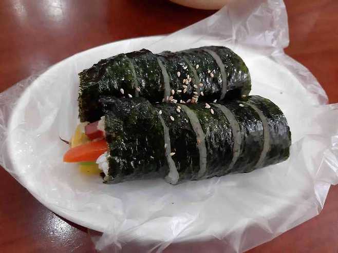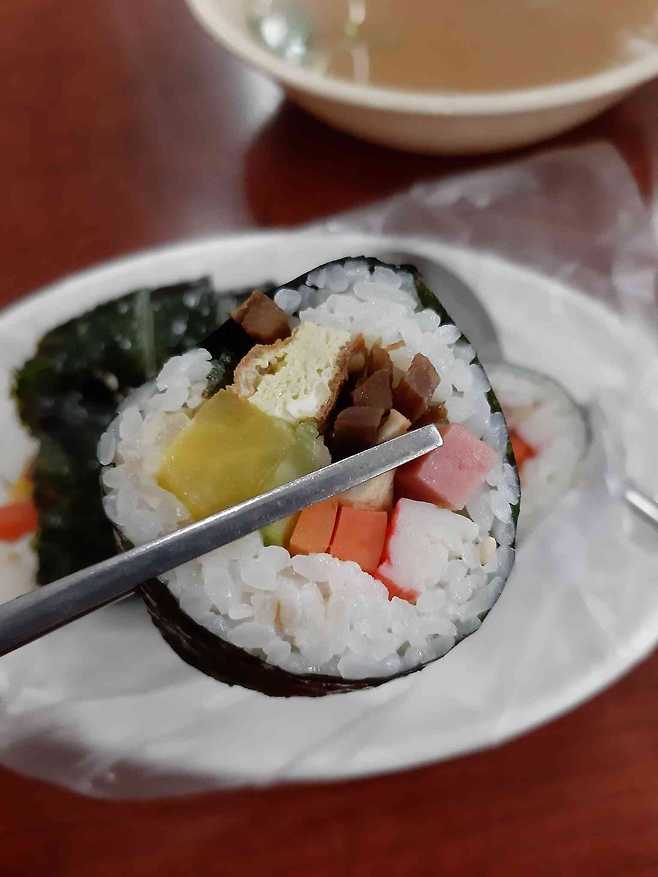 특정 지역의 상위권 맛집일 수록 생각보다 그닥인 경우를 몇번 겪었던지라 기대를 많이 누르고 방문 했다. 오후 1시가 조금 넘어서 방문 한 가게는 거의 차있었고 세분의 백발 할무니들이 정신없이 입구에 있는 주방을 누비고 계셨다. 잠깐사이에 끊임없는 배달과 오고 가는 손님들 속에서 할머니들은 손님 맞이를 할 겨를이 없어보이셨고 나는 서너번 자리의 유무를 물어 거즘 다 드신 손님을 본이 아니게 쫓아내고 자리에 앉았다. 할머니깨서는 분주하셨다가 편안히 주문을 받으시곤 다시 바뻐지셨다 . 배고픔에 멍하니 있다가 주윌 둘러보니 다들 튀김을 드시는것이 보여 급하게 튀김을 추가시켰고 곧바로 김밥과 어묵국물 한대접이 나왔는데 배고픔에 투박하게 썰린 김밥 한줄을 집어 든 순간 꼬소오한 참기름 향이 코끝에 퍼지며 어렸을때 접해본 시골서 짠 참기름향 생각이 났다. 너무 무겁지 않고 가벼운듯 꼬소한 향이 진하게 나는 그 느낌. 순간 두서점을 해치웠는데 내용물이 평범해 오히려 참기름 향을 덮지 않아 좋더라.