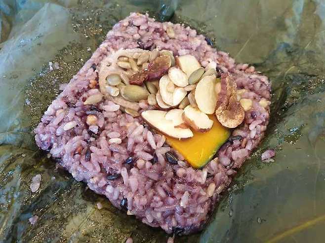 연잎밥정식의 경우 연잎밥은 그냥 무난했음. 찰밥과 흑미밥이었으며 견과류와 단호박 등 있을건 다있었음. 다만 연잎향이 조금 덜 났다 정도?