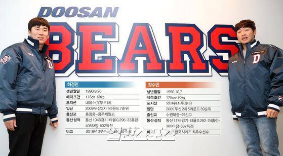 '대박'도 함께했다. 두 선수는 2020시즌이 끝난 뒤 나란히 FA(자유계약선수) 자격을 얻었다. 다른 구단의 영입 구애가 있었던 것도 비슷했다. 고심 끝에 선택한 건 2009년 프로 기회를 열어준 친정팀 두산이었다. 허경민은 최대 7년, 총액 85억원에 계약했다. 정수빈은 6년 총액 56억원에 도장을 찍었다. 일간스포츠는 2021 스토브리그 주인공이 된 허경민과 정수빈을 만났다.