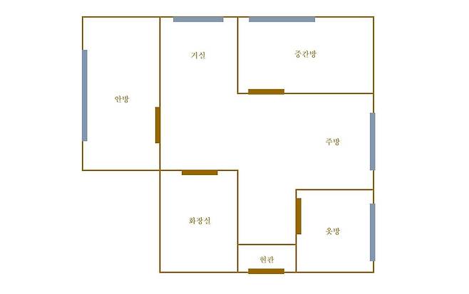 저희 집은 아파트 축소판 같은 구조의 쓰리룸 이랍니다. 거실, 주방, 안방, 중간방, 작은방, 화장실이 있고 뜬금없이 집 밖 복도에 창고 겸 세탁실이 있답니다.