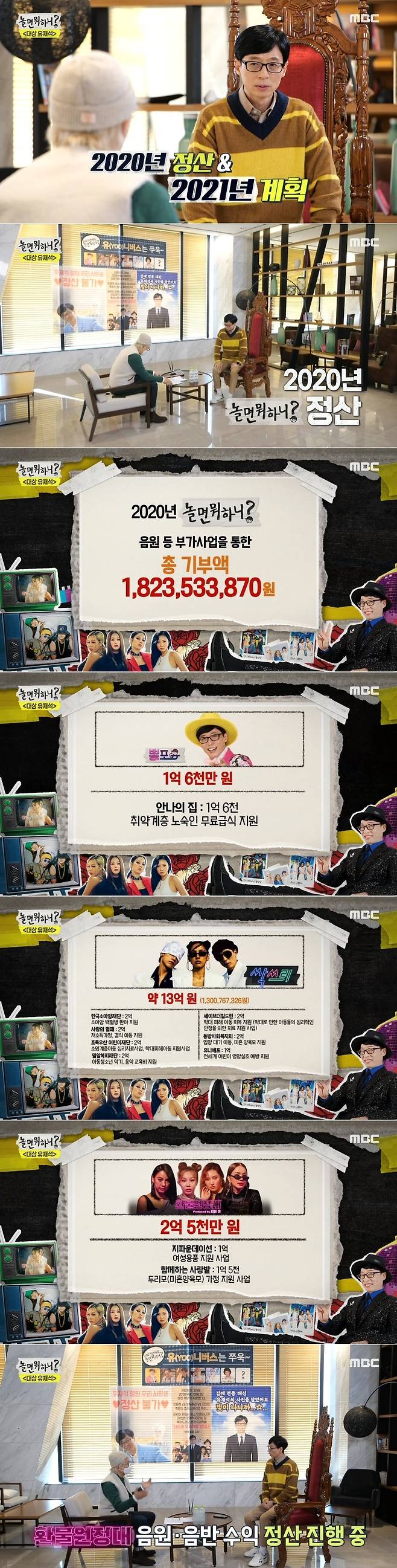 이어 공개된 2020년 '놀면 뭐하니?' 관련 음원 수익은 18억 원이 훌쩍 넘었고, 이를 기부했다고 알려 놀라움을 이끌어냈다. 액수를 들은 유재석은 "대기업에서 내는 금액 아니냐. 깜짝 놀랐다"고 반응했다.