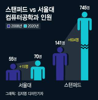 2010년대 중반을 넘어서며 4차 산업혁명과 함께 IT, 빅데이터, AI(인공지능)의 중요성이 강조됐음에도 개발 인력 공백은 메워지지 않았다. 십수년째 묶였던 서울대 컴공과 정원 55명은 지난해에야 70명으로 확대됐다. 그나마도 실리콘밸리 인재의 산실인 미국 스탠포드대의 10분의 1 수준에 불과하다. 스탠포드대 컴공과 인원은 2008년 141명에서 2020년 745명으로 증가했다.