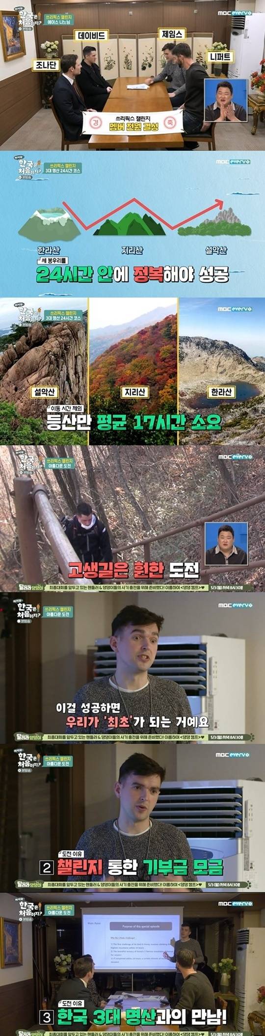 하지만 3개의 산 등반 시간은 보통 17시간이 소요됐고, 제임스는 “시간을 줄이기 위해 뛰어서 올라가야 한다”고 밝혀 놀라움을 안겼다. 제임스는 이 챌린지를 해야 하는 이유로 “첫번째는 이 챌린지를 해본 사람이 없다. 성공하면 한국 최초다. 두번째는 이 챌린지를 통해 기부금을 모을 거다. 마지막으로 한국 3대 명산과 만날 수 있다”고 설명했다.(사진='어서와 한국은 처음이지?' 캡처)