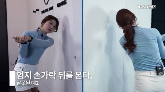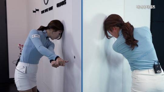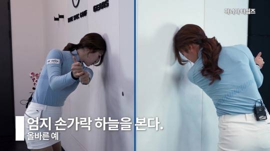 이현지 프로는 "벽을 통한 연습법은 스윙할 때 머리는 고정이 되어 있으니 손가락의 방향에 집중해야 한다"라며 "머리를 벽에 너무 누른다는 생각보다는 가볍게 닿아 있는 상태로 연습하면서 스윙에도 집중해야한다"고 설명했다.