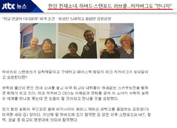 그리고 미주 중앙일보의 이 기사를 한국 민간통신사인 뉴시스가 받아 국내에 보도했습니다. 제목은 ‘한인 천재소녀, 하버드 스탠포드 러브콜…’페이스북’ 저커버그도 “만나자”’였습니다.