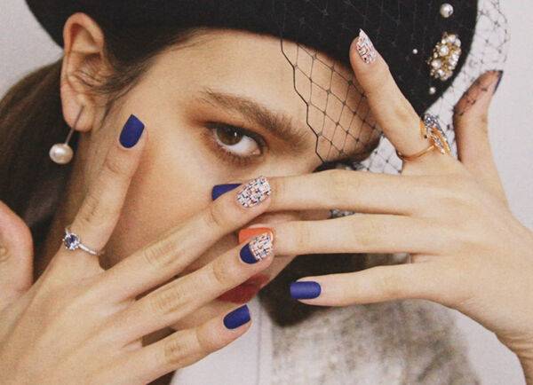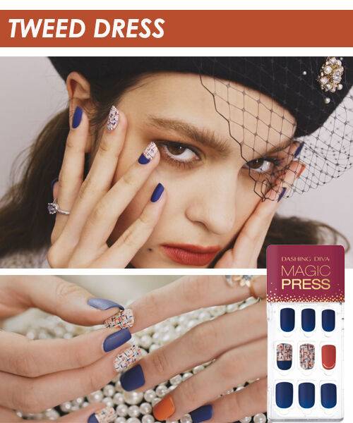 이번 시즌 부르주아 룩이 유행하면서 트렌드 룩으로 떠오른 트위드. 러셋 오렌지 컬러와 고급스러운 네이비 컬러가 더해져 피부 톤까지 화사하게 밝혀주는 아이템이다. 우아하고 기품 넘치는 무드를 뽐내기 제격. 베이직한 화이트 또는 블랙 컬러의 트위드 원피스 룩에 포인트 네일로 추천! 피부 톤이 웜톤에 가깝다면 오렌지 컬러 위주로, 쿨톤이라면 네이비 컬러를 더 많이 배치하자. 모델처럼 세련된 블랙 컬러의 베레모 또는 페도라까지 장착하면 완벽한 프렌치 부르주아 룩으로 변신.