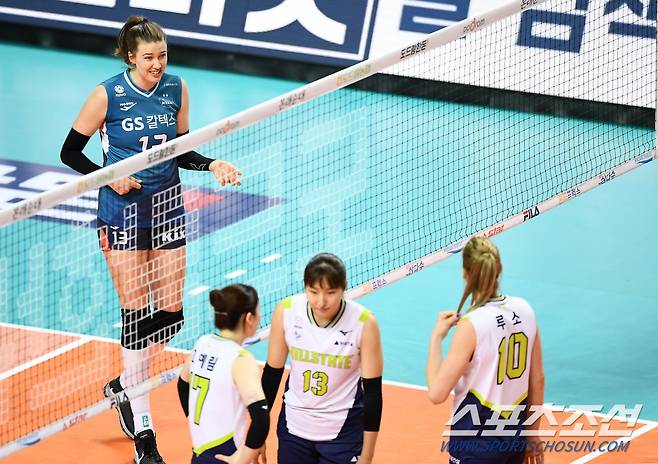 '2020-2021 V리그' 여자부 GS칼텍스와 현대건설의 경기가 5일 서울 장충체육관에서 열렸다. 경기 전 GS칼텍스 러츠가 현대건설 루소와 대화를 나누고 있다. 장충=박재만 기자 pjm@sportschosun.com/2021.03.05/
