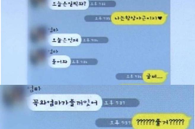 ◇ 김현정> 지금 저희가 유튜브와 레인보우로 실제 카톡 메시지를 보여드리고 있습니다. 엄마가 오늘 일찍 오니? 나는 항상 야근이지. 오늘은 언제 들어와? 글쎄. 꼭 와. 엄마가 줄 거 있어. 그래서 딸이 줄 거? 뭔데? 이런 대화네요?