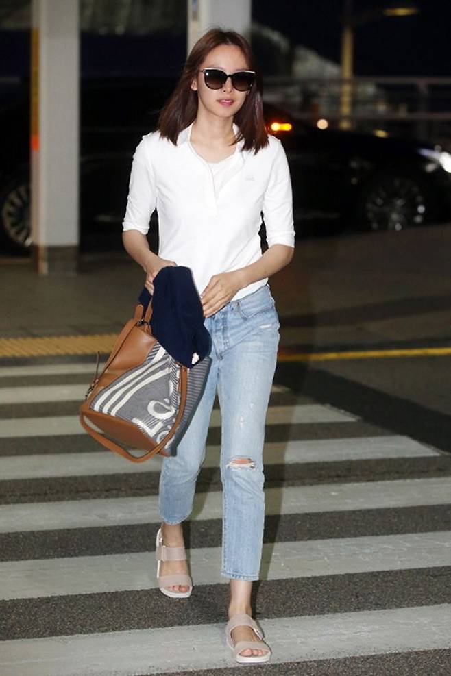 조윤희는 바디 라인을 살려주는 깔끔한 반소매 화이트 폴로 셔츠에 라이트 블루 컬러 디스트로이드 데님 팬츠를 매치했으며 스포티한 베이지 컬러 스트랩 샌들과 선글라스를 착용해 심플하면서도 트렌디한 스타일링을 완성했다.