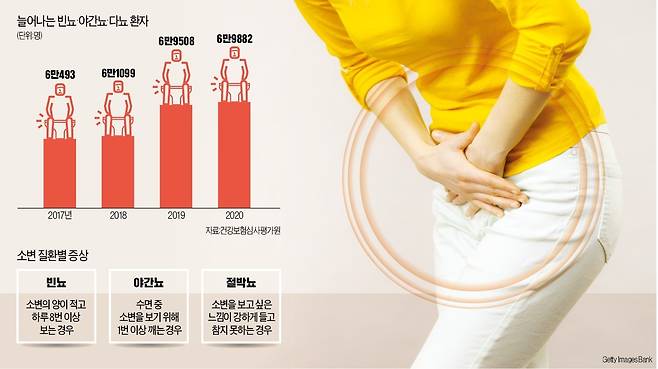 소변 관련 질환을 호소하는 사람은 점점 늘어나는 추세다. 건강보험심사평가원에 따르면 국내 빈뇨·야간뇨·다뇨 환자 수는 2016년 5만6000여 명에서 2020년 6만9000여 명으로 23.2% 늘었다.