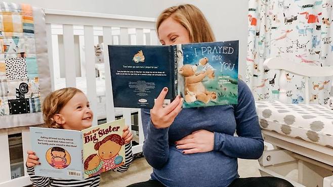 티나 깁슨이 첫째 딸 엠마에게 책을 읽어주고 있다.