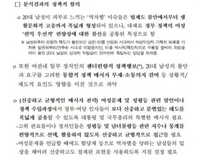 그러면서 정부·여당 인사들에게는 여성문제 및 성평등 관련 발언에서 ‘신중하고 균형있는 메시지 전략’을 펴야 한다고 제언했다. 보고서는 “고위 관료들이나 정치인들이 성평등 및 남녀불평등 관련 지수나 통계를 편향적으로 선택, 활용하지 않도록 신중하고 균형적으로 접근해야 한다”며 “할당제 등으로 역차별을 당하는 남성들의 입장을 헤아려 신중하고도 절제된 표현을 사용하도록 지침 설정이 필요하다”고 강조했다.