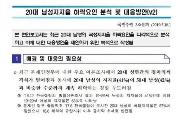 대통령 직속 정책기획위원회는 지난 2019년 2월18일 '20대 남성지지율 하락요인 분석 및 대응방안'이라는 제목의 현안보고서를 작성했다.