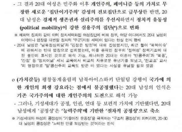 보고서는 20대 내부의 ‘젠더 갈등’ 상황도 고찰했다. “20대 남성은 대북인식, 병역, 여성정책 등 여러 측면에서 20대 여성과의 인식 차이가 매우 크다”며 “자신들이 느끼는 역차별 및 박탈감 요인이 성별 할당제, 가산제 등 민주화 이후 지속적으로 강화된 여성 편익 친화적 정책에 기인한다고 믿는다”고 평가했다.