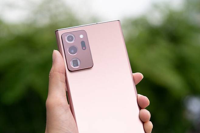 사람들의 시선도 카메라에 쏠렸다. 후면 전체 면적의 약 6분의 1 가까이 차지하는 넓은 카메라 모듈의 크기에 한 번. 카드 두어 장을 겹쳐도 남는 ‘카툭튀’에 한 번. 태평양 같은 카메라에 사람들의 가슴은 웅장해진다. 문제는 카메라에 쏠린 시선이 제품 전반으로 옮겨가지 않고 카메라에만 머물러 있다는 점이다. 갤럭시노트20 울트라에 대한 대부분의 평가가 인상 비평에 그친다. 하지만 갤럭시노트20 울트라는 카메라 디자인만 놓고 얘기하기엔 아까운 제품이다.