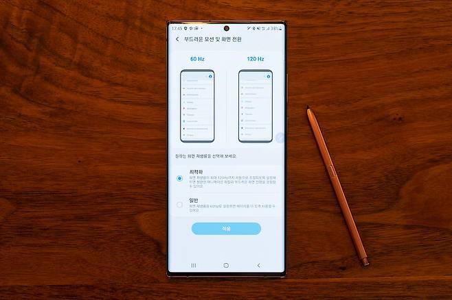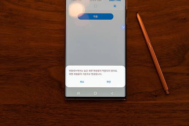 아쉬운 부분은 갤럭시S20의 120Hz 화면 제약 조건도 그대로 가져왔다는 점이다. 디스플레이가 지원하는 최고 해상도인 WQHD 플러스(3088×1440)에서는 작동하지 않고 그 아래 해상도로 설정해야 쓸 수 있다. 전력 소모 문제 때문이지만, 이용자는 고해상도냐 부드러운 화면이냐 선택의 기로에 선다.