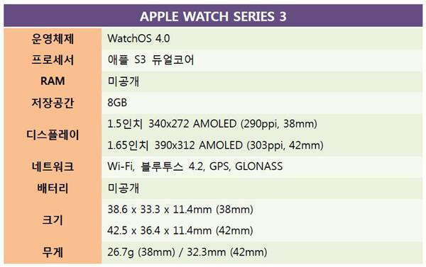 2014년 9월 기습적으로 공개되고 그로부터 반년도 더 지난 2015년 4월 처음 출시된 애플 워치는 많은 사람들의 예상과는 달리 원형이 아닌 사각 디스플레이를 채택했다. 첫 애플 워치가 출시된 후 또 많은 사람들은 다음 애플 워치는 원형 디스플레이가 채택될 것이라고 내다봤지만, 예상은 보기 좋게 빗나가 두 번째 모델인 애플 워치 시리즈1도 사각 디스플레이를 채택했다. 이러한 기조는 네 번째 모델인 애플 워치 시리즈3에서도 그대로 유지되고 있다. 애플 워치 시리즈3는 2015년 출시된 첫 모델부터 이어져온 디자인을 그대로 유지하고 있다. 제품 구성도 달라지지 않았다. 애플 특유의 화이트 박스 패키지 안에는 애플 워치 본체와 여분의 밴드, 그리고 충전용 AC 어댑터와 무선 마그네틱 충전 케이블이 제공되고 있다.