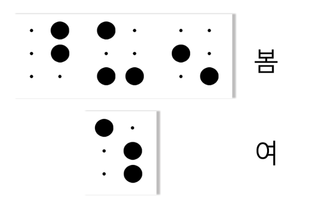 점자는 지면이 볼록 튀어나오게 점을 찍어 손가락 끝의 촉각으로 읽을 수 있도록 만든 문자이다. 프랑스의 시각장애인 루이 브라유가 창안한 6점식 점자 체계가 현재 국제 표준으로 쓰이고 있다. 가로 두 칸, 세로 세 칸의 공간에 점을 배치해 자음과 모음을 만든다. 왼쪽 위에서 아래로 1점, 2점, 3점, 오른쪽 위에서 아래로 4점, 5점, 6점으로 번호를 붙여 구분한다. ‘봄’을 점자로 옮기면 ‘ㅂ’은 45점, 모음 ‘ㅗ’는 136점, 그리고 받침 ‘ㅁ’은 26점이 결합하여 표기된다.