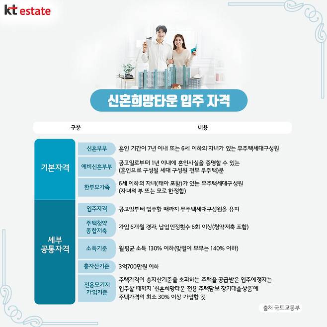 신혼희망타운에 입주하려면 △혼인 기간이 7년 이내 또는 6세 이하의 자녀가 있는 무주택세대구성원 △혼인을 계획 중이며 모집공고일로부터 1년 이내에 혼인사실을 증명할 수 있는 무주택세대구성원 △6세 이하의 자녀가 있는 한부모 무주택세대구성원이어야 합니다.