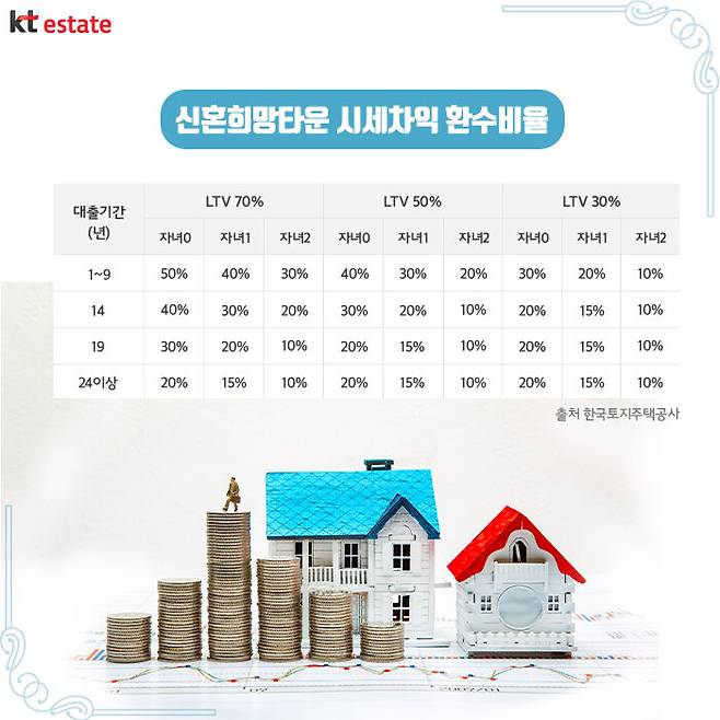 특히 기금에서 환수해가는 환수비율은 대출 이용 기간이 짧을수록, 자녀 수가 적을수록 높아지게 됩니다. 예를 들어 분양가의 70%를 대출받을 경우 대출 기간이 10~14년 이하, 자녀가 둘이면 기금이 가져가는 정산비율은 20% 수준이지만, 대출 기간이 10년 미만으로 짧고, 정산 시점에 자녀가 없다면 매각차익의 절반을 기금에 내야 합니다. 대출 기간이 짧아 이자를 적게 내더라도 상환 시엔 결국 수익을 더 반환해야 하는 구조인 것입니다.