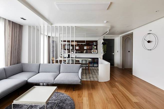 중문에서 이어지는 가벽과 세로로 세워진 파티션으로 북카페형 서재의 공간을 분리한 부분이 신의 한 수였어요.