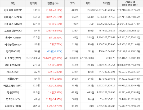 또한, 비트토렌트(43.12%, 3.95원), 펀디엑스(28.16%, 8.51원), 헌트(24.95%, 576원), 옵저버(23.39%, 42.2원), 리퍼리움(18.75%, 28.5원), 메인프레임(15.25%, 32.5원), 저스트(15.09%, 122원), 메디블록(6.73%, 111원), 무비블록(5.81%, 27.3원), 스톰엑스(5.17%, 83.4원), 엠블(2.99%, 48.2원), 리플(1.65%, 554원)이 상승세를 나타냈다.