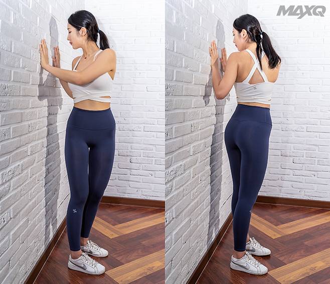 HOW TO 벽을 마주 보고 선 뒤 다리를 앞뒤로 벌린다. 양발의 너비를 유지한 상태에서 앞쪽 다리는 굽힌다. 양손으로 벽을 짚어 균형을 잡은 뒤, 상체를 천천히 내려 앞쪽 다리 무릎을 굽혔다 펴며 스트레칭한다. 반대쪽 다리도 반복한다.