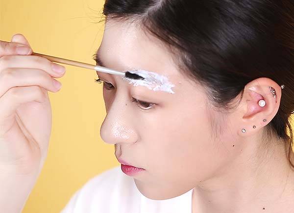 이때 스크루 브러시를 이용해 눈썹을 빗어주면 더 골고루 탈색제를 묻힐 수 있어요. 이제 원하는 색이 나올 때까지 기다리세요.