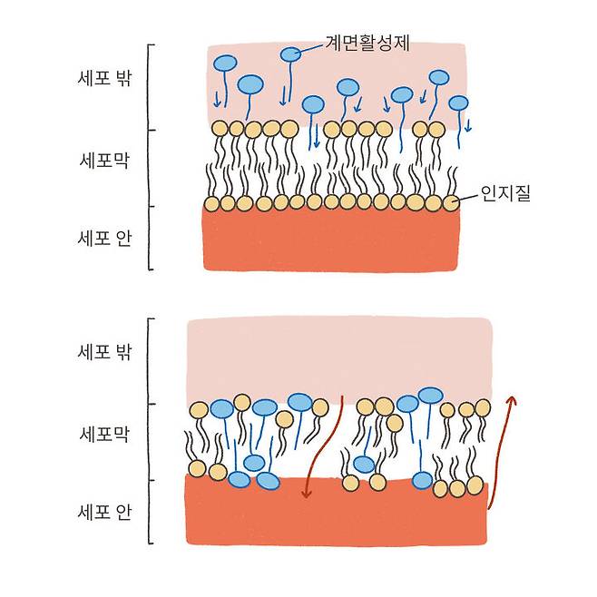 이때 계면활성제는 차곡차곡 배열된 세포막 사이로 끼어들어가 정자의 세포막 구조를 손상시킵니다.