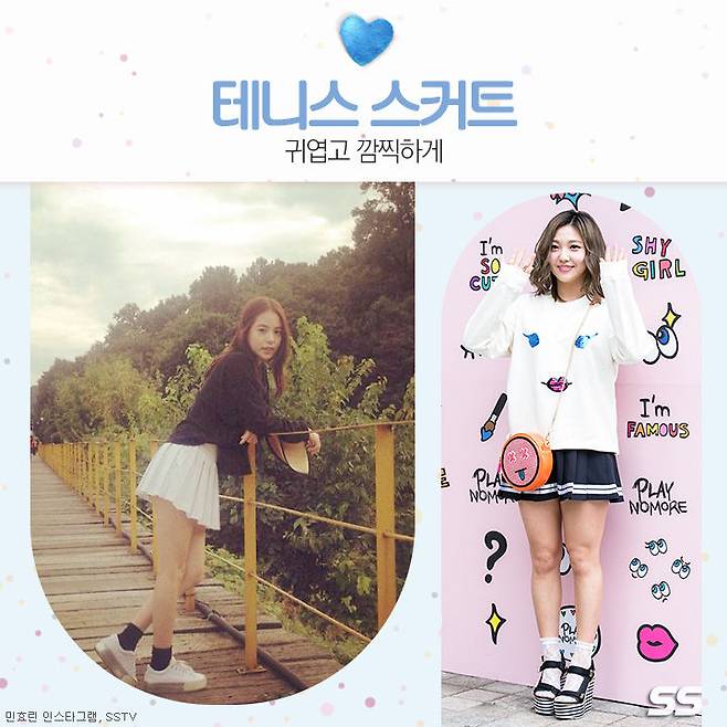 원피스와 스커트는 키작녀들의 필수템인데요. 테니스 스커트는 특유의 발랄한 느낌과 체형 커버에도 효과적이죠. 엉덩이나 허벅지 쪽에 살이 많은 경우 더욱 잘 어울리는 테니스 스커트와 맨투맨을 매치하면 아담 사이즈 키작녀의 장점을 더욱 살릴 수 있어요.