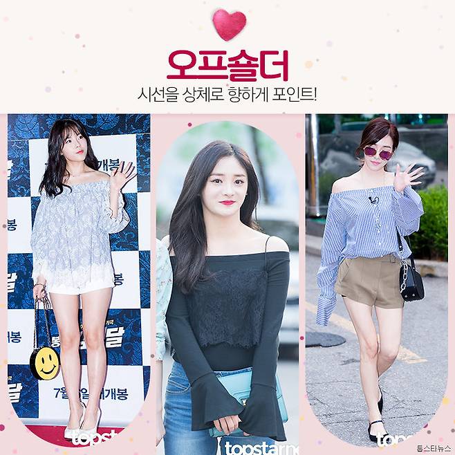 시선이 상의 쪽으로 향하게 코디를 한다면 키가 커 보인다는 사실 알고 계시죠? 하의는 단순하게 코디하고 상의를 밝게 포인트가 되도록 코디하면 좋은데요. 이제 곧 여름이니 오프숄더로 코디해보면 어떨까요?