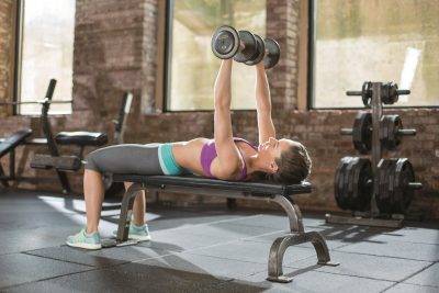 양손에 덤벨을 쥐고 정면을 바라보면서 벤치에 눕자. 팔꿈치는 몸통에 가깝게 붙이고 덤벨을 이두근과 평행하도록 잡자(A). 숨을 내쉬면서 덤벨을 가슴 위로 들어 올리고 다시 시작 자세로 돌아가자(B).
