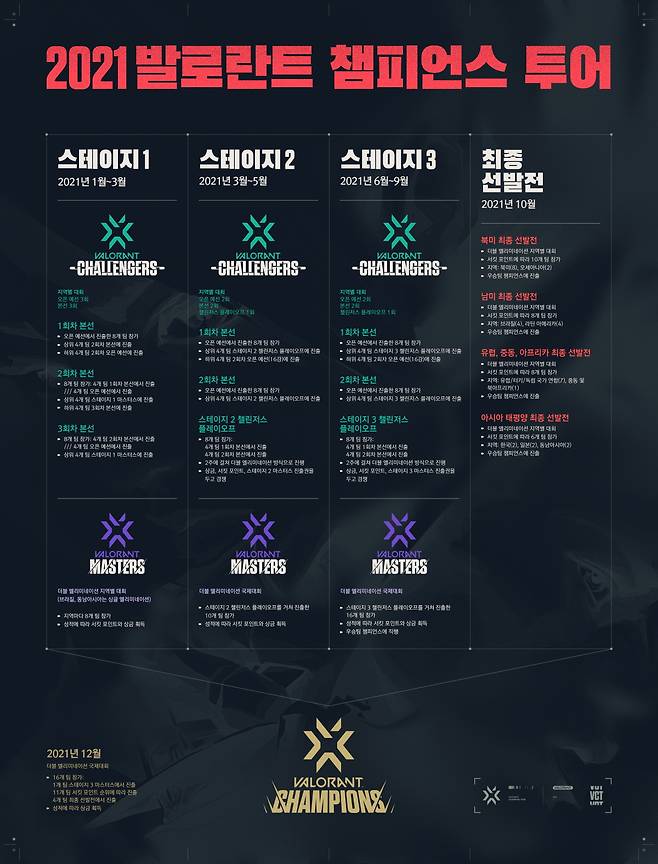 발로란트 챔피언스 투어 마스터스 스테이지3 우승팀과 각 지역의 서킷 포인트 1, 2위 등 11개 팀, 지역별 최종 선발전을 통과한 4개 팀 등 총 16개 팀이 참가하는 발로란트 챔피언스는 12월에 열릴 예정이며 정확한 일정과 장소는 추후에 공개될 예정이다.