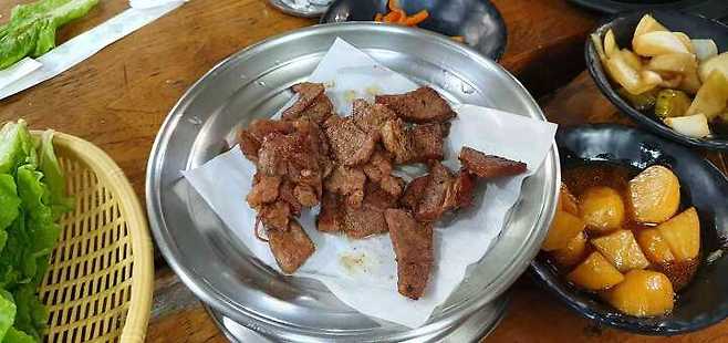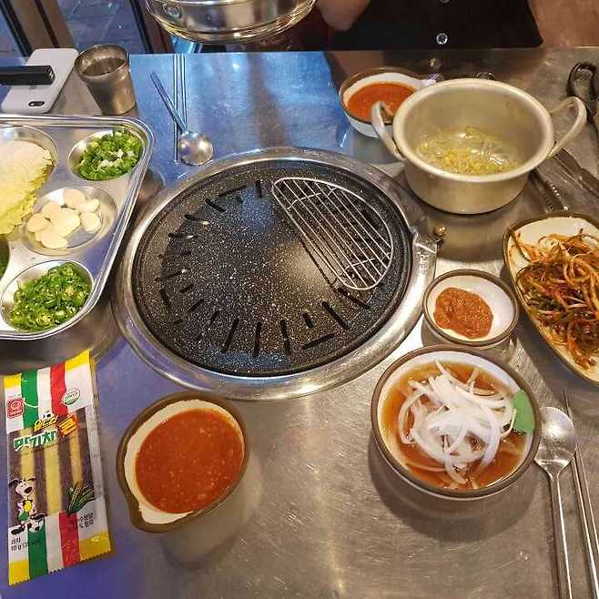 고기를 찍어먹는 양념장이 조금 특이하게 그릇에 간장과 파, 그리고 여기에 붉은양념이 얹어져서 나옵니다. 처음 본 방식인데 맛은 짭쪼롬 하긴 하지만 아주 특이하진 않았습니다.