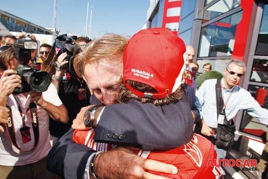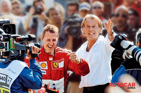우리의 대담이 15분쯤 지난 뒤 문득 이 여윈 64세의 회장과 페라리의 전설적인 창업자 엔초 페라리 사이에 유사성이 있다는 생각이 들었다. 엔초가 40년 동안 군림했던 발자취에 몬테제몰로가 들어섰다. 두 사람은 위상, 배경이나 성(姓)이 같지 않다. 하지만 몬테제몰로는 20년간 기록적인 판매량과 슈마허를 선두로 수많은 F1 세계타이틀을 거둬들였다. 이에 힘입어 엔초에 맞먹는 절대적 권위에 거의 도달했다. 신속하게 결정을 내리고, 그가 가까이 다가가면 누구나 벌떡 일어나기를 바라고, 실제로 누구든 그렇게 하고 있다. 페라리에 대한 그의 사랑은 젊은이보다 더 뜨겁다. "나는 지난 20년간 한 자동차회사에서 일한 유일한 회장이다. 이처럼 위대한 기업의 회장 자리를 지켜온 것을 정말 자랑스럽게 생각한다"