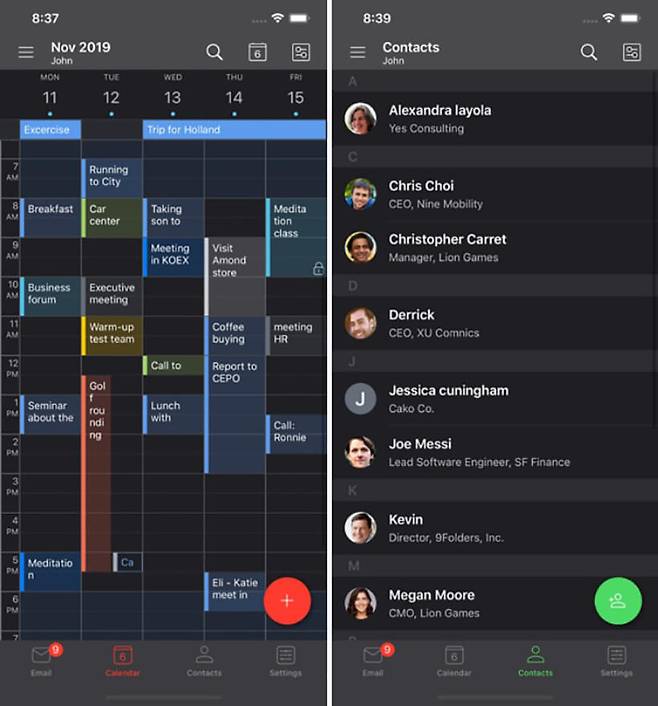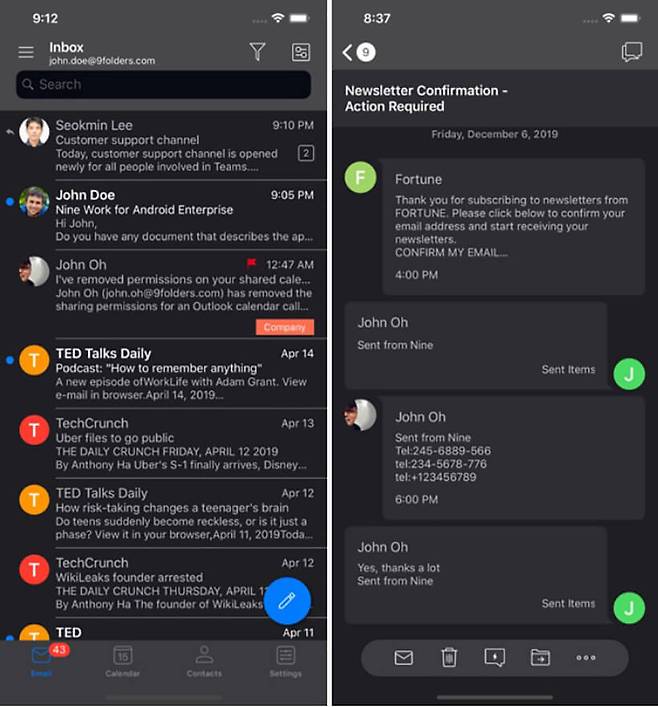 웬만한 업무와 소통을 이메일로 하는 유저들에게는 Nine Mail이 좋은 선택이 될 수 있다. Exchange 서버를 기반으로 메신저 기능을 제공하며, 주소록 관리부터 일정 관리까지 전반적인 비즈니스 앱으로도 손색이 없다. 아쉽게도 Airmail처럼 제한적 유료 앱도 아니고, 2주의 체험 기간이 지나면 무조건 유료 버전을 구매해야만 하는 치명적 단점이 있다.