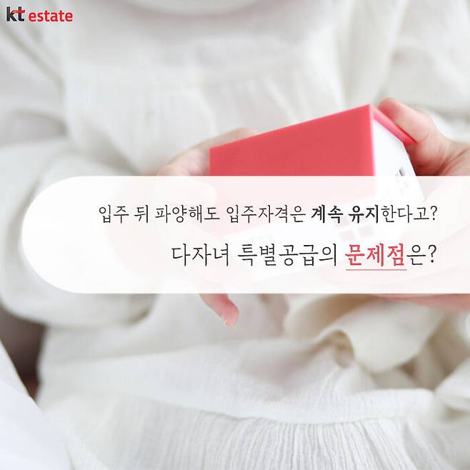 문제는 입양으로 다자녀 특별공급을 받고, 입주 이후 파양하더라도 입주자격이 유지된다는 점입니다. 현행 주택공급에 관한 규칙 제40조 등에 따르면, 태아나 입양한 자녀를 포함해 특별공급에 당첨됐을 경우 입주 시까지 그 입양을 유지하면 됩니다. 이 규정은 곧 입주 이후엔 파양해도 관계없다는 뜻으로 해석될 수 있는 대목입니다. 해당 자격 유지기간을 ‘입주 시까지’로 정하고 있기 때문입니다. 2016년에는 이와 관련해 모 부동산 카페에서 한 회원이 입주 후 파양해도 괜찮냐는 글을 올려 온라인에서 크게 공분을 산 일이 있었습니다.