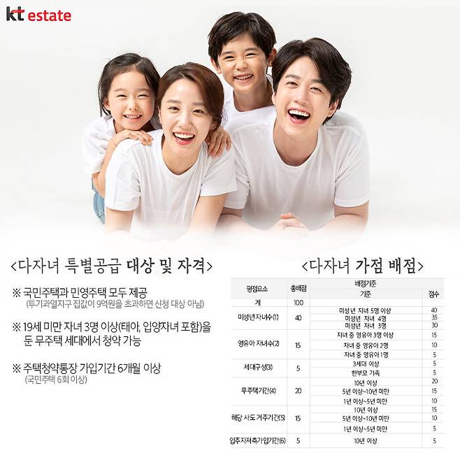 다자녀 특별공급이란 자녀가 3명 이상인 경우 제공하며, 국민주택 전체 물량의 10%를 배정하는 특별공급 제도를 말합니다. 지원 요건에는 우선 입주자모집공고일 현재 미성년자인 자녀 3명 이상을 둔 무주택세대구성원만 가능하며, 이때 태아나 입양한 자녀도 인정됩니다. 미성년 자녀수가 많을수록 청약가점은 높아지며, 특히 만 6세 미만의 영유아가 많다면 가점은 더 높아지게 됩니다. 예를 들어 세 쌍둥이를 낳은 집이면 당첨이 더 유리한 셈입니다.