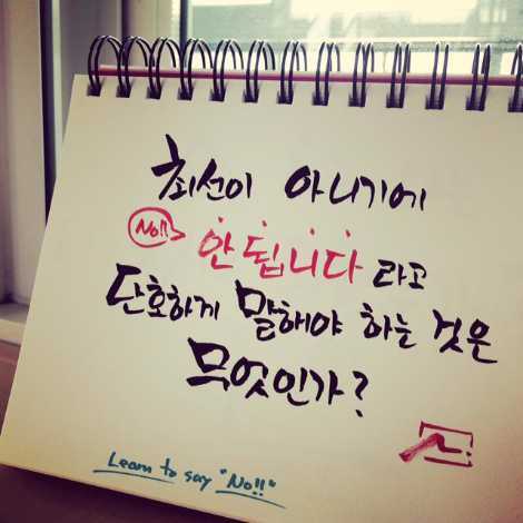최선이 무엇인지 배우고 깨우쳐 가는 과정에서 꼭 필요한 것은 솔직함이다. 최선을 선택하는 것에는 용기가 필요하다. 최선이 아닌 것을 거절할 용기, 최선이 아닌 것을 거부할 용기. ‘아니요(No)’라고 말하지 못하면 최선에 다가설 수 없다. 자신의 최선을 포기하고, 타협하고, 강요에 따르는 것이 최선일 리 없다.