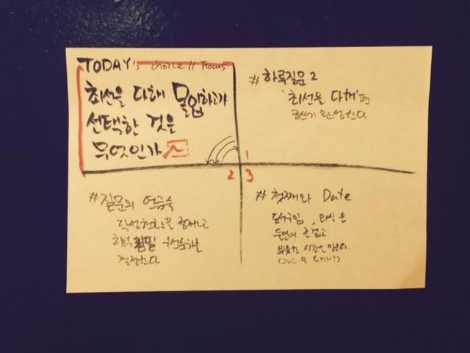 하루가 끝날 때 즈음 최선을 다 했는가를 물어야 한다면, 하루가 시작될 때 먼저 해야 할 것이 있다. 하루가 시작될 때 ‘오늘 최선을 다하고 싶은 것’을 선택하고 기록하는 시간을 가져보자.