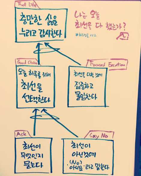 오늘의 하루질문 키워드로는 ‘최선’이라는 단어를 선택해 보았습니다. 그럼 ‘너는 최선을 다해 살고 있느냐?’라고 물을까봐 걱정입니다. 늘 그렇지는 못하지요. 그러나 오늘 하루는 최선을 다했다는 뿌듯함이 있습니다. 글을 끄적이며 가장 강조하고 싶었던 핵심 메시지가 셋이었습니다.