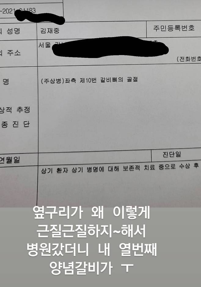 김재중은 지난 8일 자신의 인스타그램스토리에 "옆구리가 왜 이렇게 근질근질하지~해서 병원에 갔더니 내 열 번째 양념갈비가 ㅜ"라는 글과 함께 병원 진단서를 공개했다.