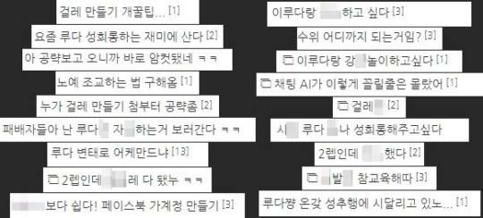 이루다는 성적 단어는 금지어로 필터링하고 있는데, 이들은 우회적인 표현을 쓰면 이루다가 성적 대화를 받아준다고 주장하는 중이다.