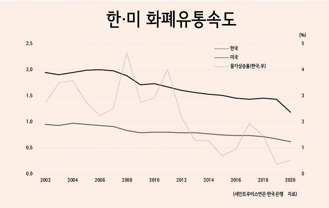 코로나19 이후 수조 달러의 돈을 푼 미국도 지난해 이 속도가 크게 떨어지긴 했지만 아직 우리나라의 두 배 수준이다. 세인트루이스 연방준비은행에 따르면 미국의 지난해 화폐유통속도는 1.19로 재작년보다 17.5% 줄었지마 여전히 1을 상회하고 있다.