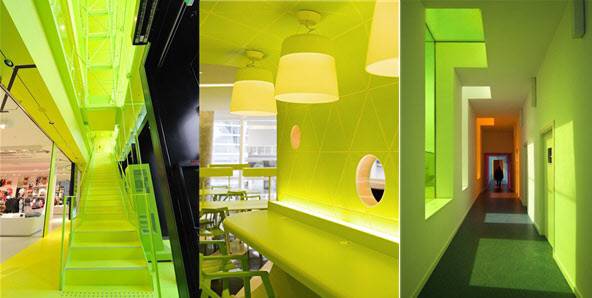 플루오 그린은 미래지향적이고 활기찬 분위기를 조성하는 색이다. 밀레니얼 세대를 대상으로 하는 상업 공간에 활용할 경우 감각적인 느낌을 더할 수 있다.